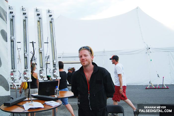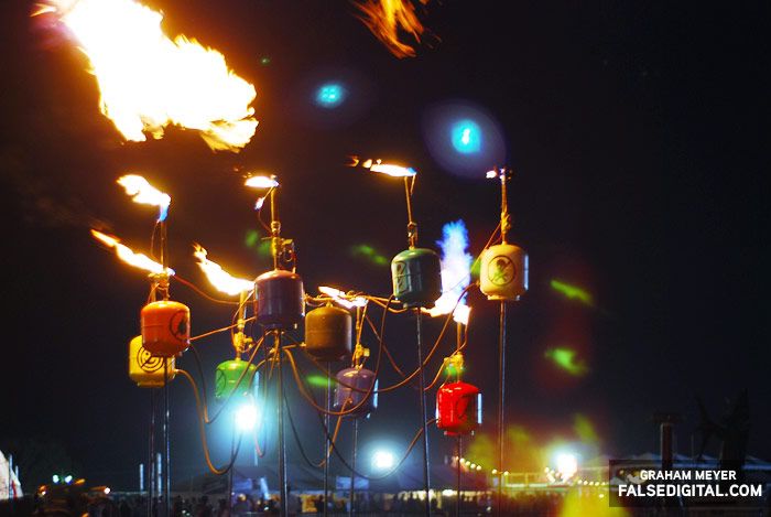 -LEMUR also built the pyro contraption below that released propane bursts against the flames when the buttons on the crazy LED pad are pushed. They told me it runs on MIDI control.